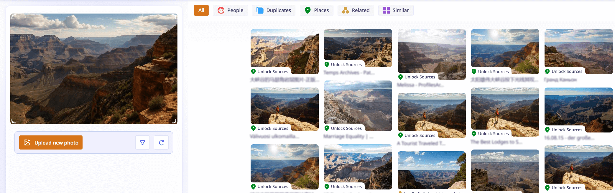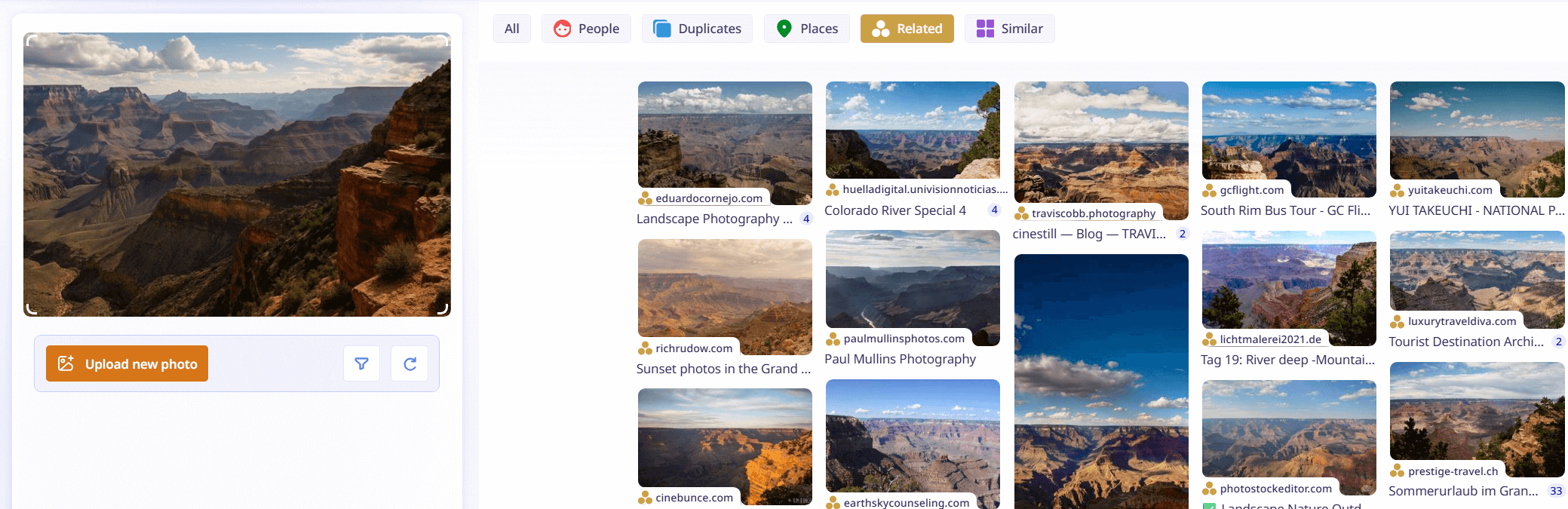 Our image doesn’t feature people, so there are no results in that category, but if we go to the Places category, we will get detailed results about images from this location, and the Related category will provide us with additional photos from the surrounding area around the Grand Canyon.